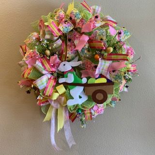 Just how cute is this! A bunny is delivering a cart of Easter eggs to his garden. Ribbons and bows adorn this deco mesh wreath, complemented with sprays of flowers and tiny Easter eggs that are nestled within the wreath. What a statement this wreath would make as a front door hanger, on a wall in the hallway or foyer, or on the wall in the living- or great-room. Welcome Easter and Spring with this delightful wreath.